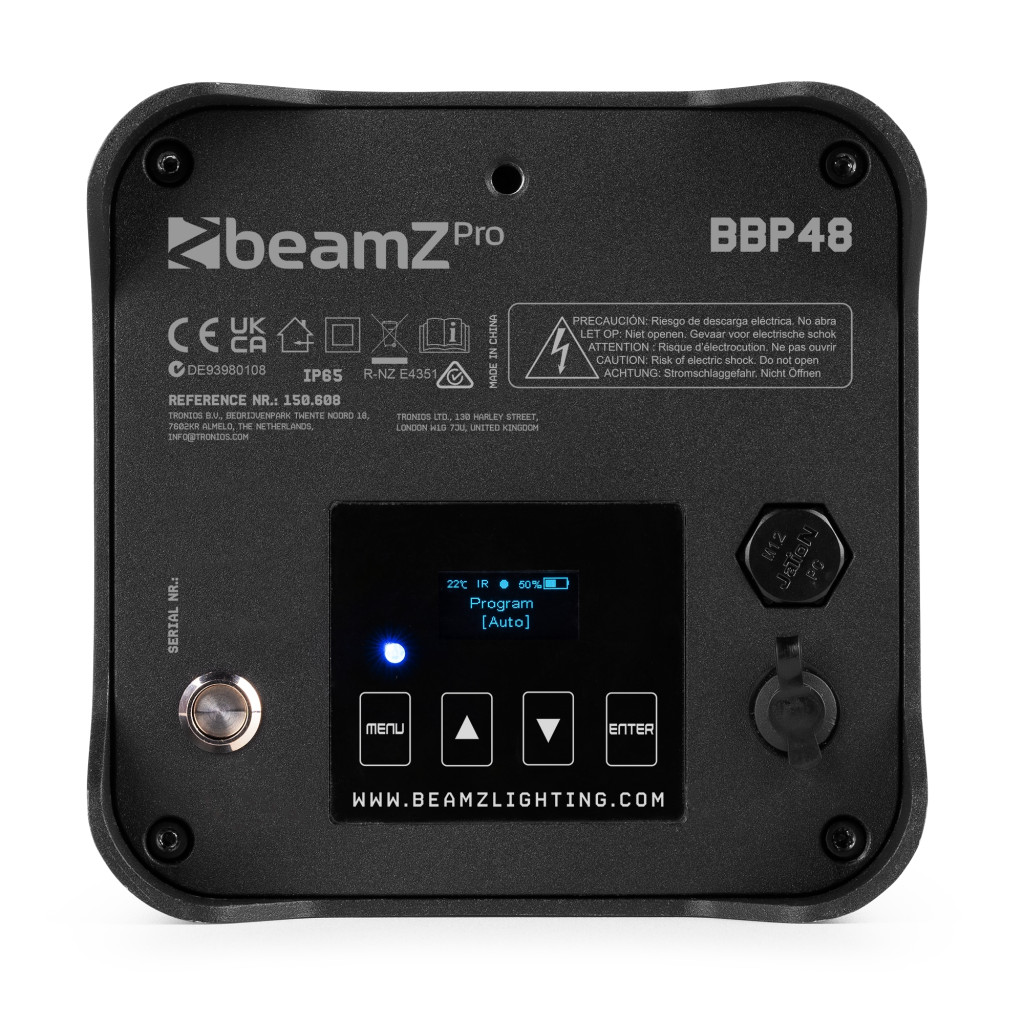 A BBP48 egy kompakt akkumulátor-par, amely ideális kiemelésre és világításra. A BBP48 IP65 besorolású, így kültéri és beltéri használatra is alkalmas. 9x szuperfényes, 12 W-os RGBAW-UV LED-del van felszerelve, és fix beépített akkumulátorral van felszerelve, amely a színektől és az intenzitástól függően akár 18 órát is kibír teljesen feltöltött állapotban. Az állítható láb különböző szögekben rögzíthető a par szögletes elhelyezéséhez. A BBP48 többféle módon tud kommunikálni, DMX és vezeték nélküli DMX segítségével. Így az egységek könnyen csatlakoztathatók egymáshoz.
