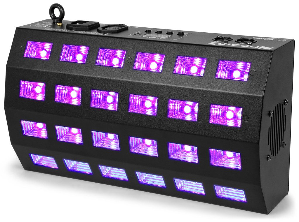 Erős és erős LED Flood ultraibolya LED-ekkel. A LED-ek 4 külön vezérelhető szegmensre vannak osztva, így lehetőség nyílik kifutópálya-effektusok létrehozására. Mivel a LED-ek enyhe szögben vannak elhelyezve, nagyon széles fényeloszlást hozhat létre, és nagy területet fedhet le. IEC be-/kimenettel felszerelve több egység összekapcsolásához.
