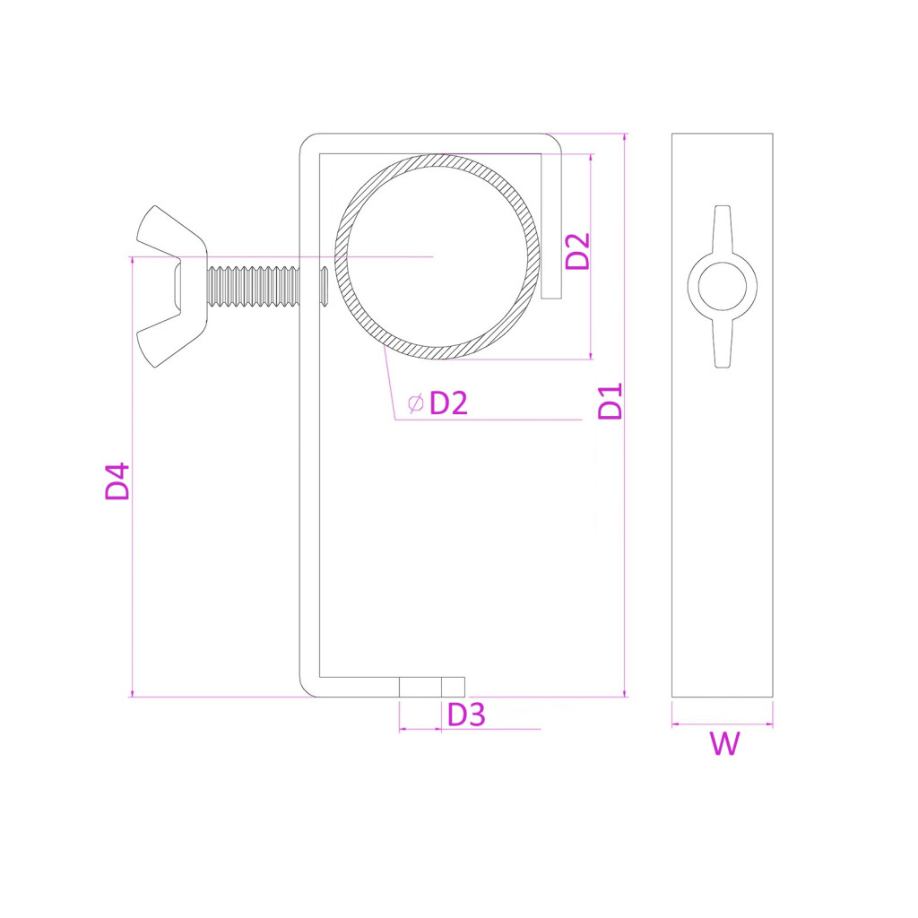 Erős fém csavarbilincs, tartósra épített, kifejezetten a fényeffektusok biztonságos rögzítésére tervezve. Legfeljebb 50 mm átmérőjű oszlopokhoz illeszkedik.
