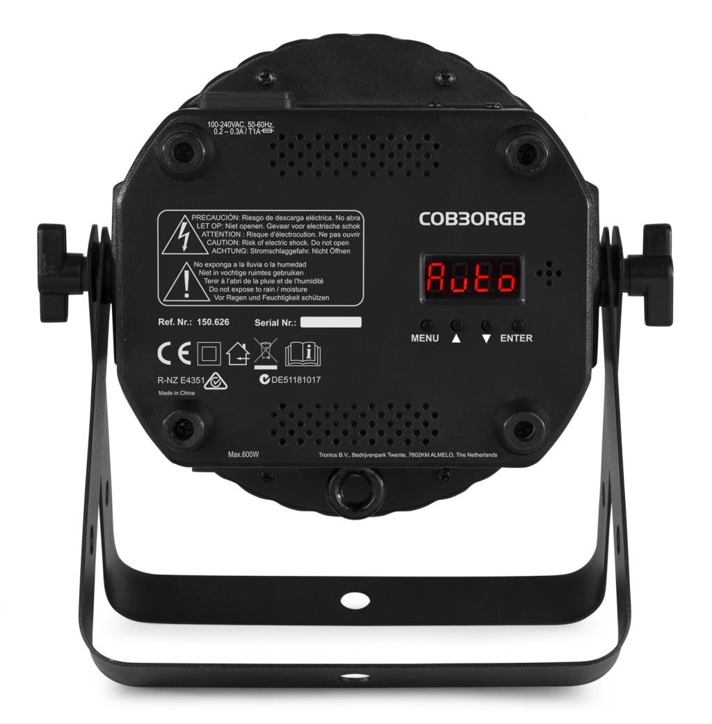 A COB30RGB egy lapos PAR, amely nagy teljesítményű, 30 W-os COB (chip-on-board) LED-del van felszerelve, és 30°-os sugárzási szöget hoz létre. A lámpatest számos statikus színt és színkeverést kínál. Beépített automatizált és hangaktivált programokkal, villogó és elektronikus fényerő-szabályozással rendelkezik, hogy menet közben is használható legyen, vagy alakítsa ki saját megjelenését a 8 csatornás DMX mód segítségével. Az infravörös távirányító leegyszerűsíti a kezelést és kiküszöböli a programozás fáradalmait. Több egység összekapcsolásának lehetősége.